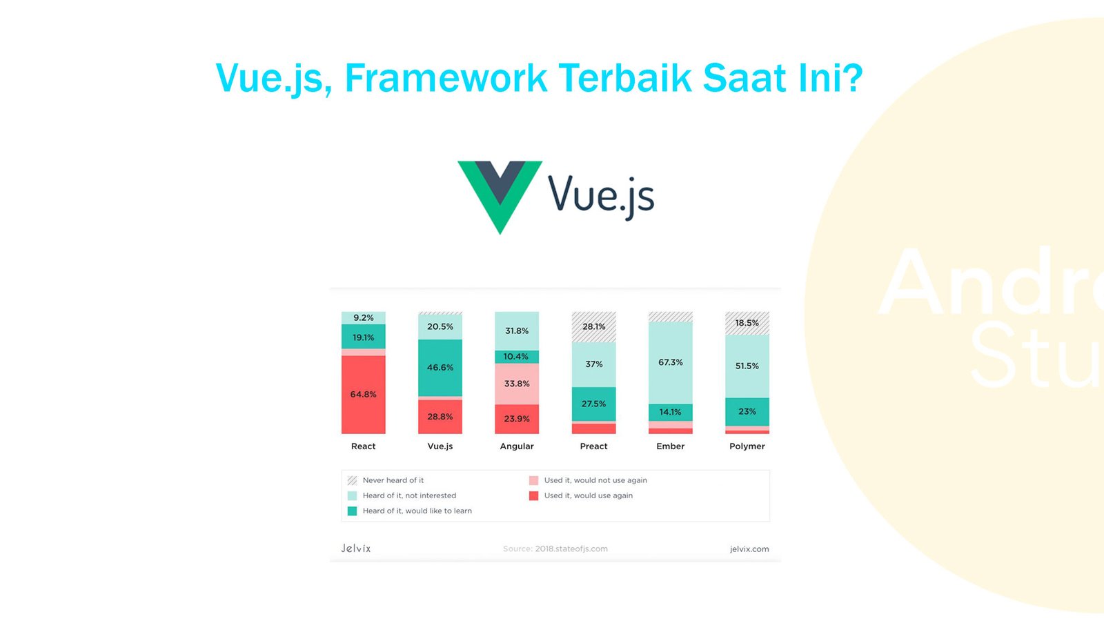 Vue mengambil framework JS terbaik dan menggabungkannya dalam satu teknologi. Tapi meskipun jauh lebih fleksibel daripada yang lain, itu juga bisa menjadi kelemahan. Tidak setiap pengembang dapat merasa nyaman jika tidak ada struktur atau batasan apa pun. Kami juga membandingkan Vue dengan framework JS lainnya baru-baru ini.
